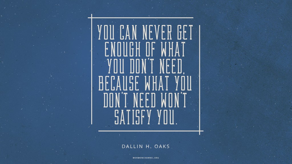 Now for direction. You’re level again, but you are still off track. You still run the risk of following a path simply because it feels familiar. Even misery can feel safe if you stick with it long enough. Take a step away from misery. Instead of making a new, ambitious goal, just identify the next step. Turn your head in the direction of light or warmth or truth. Turn away from ease and comfort and short-acting dopamine hits on social media that always leave you wanting. U2 sang it so well. You can never get enough of what you don’t really need. But I like what President Dallin H. Oaks of the Church added here when he quoted an unknown source for that line ten years earlier:
