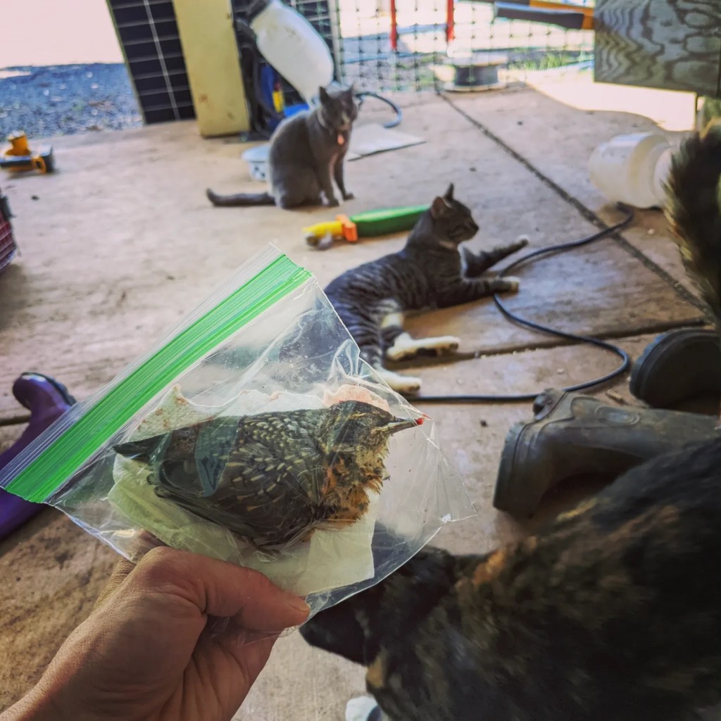 And another incident we prefer not to stumble upon, but it’s bound to happen. These cats act as magnificent pest control: moles, gophers, shrews, mice, voles, all the troublemakers–but the baby birds? That’s when it hurts, and those are easy pickings right now.